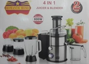 تیغه محکم آبمیوه گیری 4 کاره رومانتیک هوم حریف قدر انواع میوه با سختیهای گوناگون است. این دستگاه 4 کاره علاوه بر آبمیوه گیری، قابلیت آسیاب کردن، خرد کردن و مخلوط کردن هم دارد. تیغه آن از جنس استیل بود و گنجایش مخزن آبمیوه گیری آن یک لیتر و پارچ مخلوط کن آن یک لیتر است.